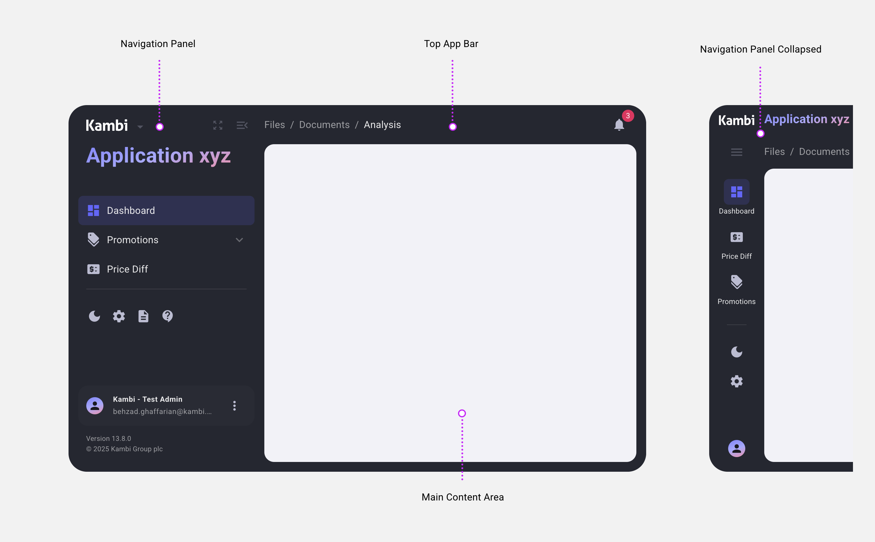 Navigation Panel: Fixed width, collapsible, dark-themed for streamlined access. It includes primary navigation, app settings, user profile access, and collapsible sub-menus. Open by default on larger screens, collapsible for smaller ones.